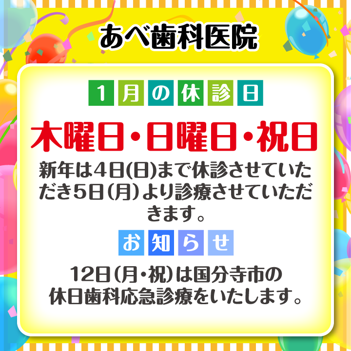1月休診日情報|あべ歯科医院 |国分寺市の歯医者・歯科